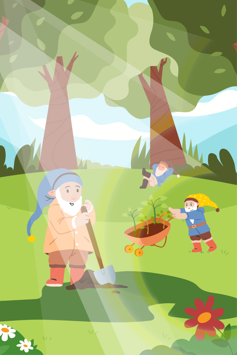 Ze wees naar het bos. “Een boom groeit niet alleen voor zichzelf. Hij leeft samen met de aarde, de bijen, het water en de andere planten.” Ze legde haar hand op de grond. “Als je de natuur uitput, raakt alles uit balans.” De dwergen knikten langzaam. “Dat is de eerste les,” zei Sneeuwwitje. “Zorg voor het bos, en het bos zorgt voor jou.”