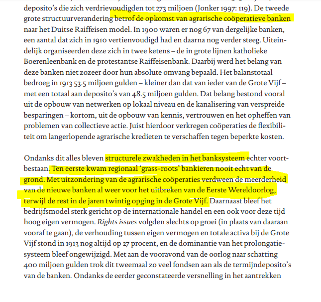 In de studie van de WRR kun je lezen dat er tussen 1900-1930 veel kleine ‘grass-roots’ initiatieven waren die hetzij opgingen in boerenleenbank of raiffeissenbank of stopten te bestaan. Zo’n proces waarin de sterke/professionele partijen overblijven noem je een shake-out. Door een shake-out in de markt wordt het kaf van het koren gescheiden. In de loop der tijd blijkt vanzelf welke partijen het beter doen dan anderen. Op deze manier waren er ook allerlei andere banken actief in de jaren 1900-1930. Uiteindelijk bleef er een kleiner aantal over. Maar er was ook overmoed in de markt. Er was een partij die zich verslikte in de overnames en dat was de Rotterdamsche bank. De man aan het roer geloofde iets teveel in zichzelf en dat ging mis. De bank moest gered. Zie het prachtige boek De vergeten bankencrisis van Lodewijk Petram.
