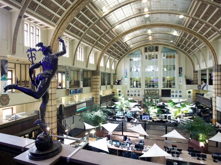 Cherelt Kroeze | Stichting Capital AmsterdamAls je bijvoorbeeld naar RTLZ kijkt, komt bij beursitems meestal beursplein 5 in beeld. Je ziet dan de oude beursvloer. Daarop zijn beurshandelaren aan het werk. Boven hun bureaus hangen inderdaad een soort van doeken. Waar die voor dienen vroegen we aan Firos Joeman. Hij is werkzaam bij de afdeling Facilities bij Euronext.