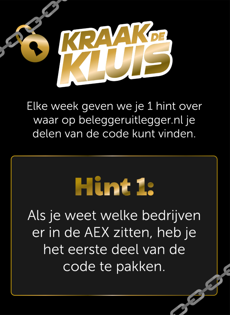 Tussen 1 oktober en 31 oktober 2024 zul je elke week een post met een hint voorbij zien komen op ons TikTok en Instagram account (@BeleggerUitlegger). De volgorde van de cijfers mag je zelf uitzoeken, we maken het je natuurlijk niet te makkelijk. Je kunt ook zelf voor detective gaan spelen en op zoek gaan naar de overige nummers als je denkt het zonder hints te kunnen!